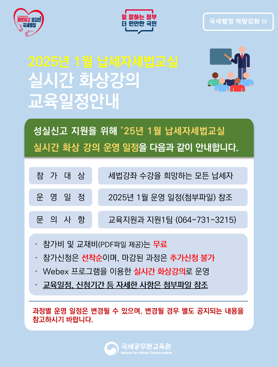 2025년 1월 5일자로 납세자세법교실 온라인 교육 운영 안내가 나왔는데요. 그 내용을 일부 안내해 드리겠습니다.